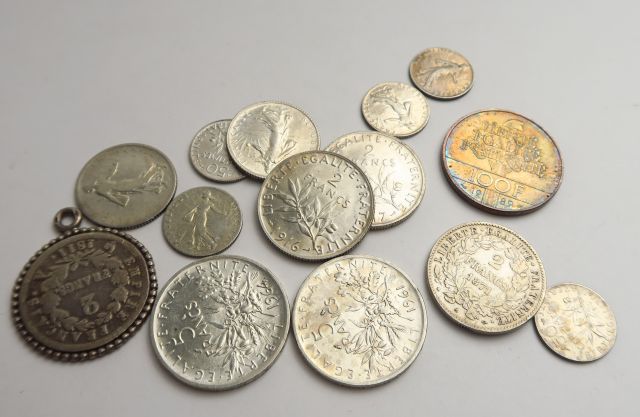 14 pièces en argent : 1 pièce de 100 francs, 2 pièces de 5 francs, 3 pièces de 2 francs, 2 pièces de 1 franc, 5 pièces de 50 centimes de francs, et une pièce de 2 francs montée. Poids de l'ensemble : 88 g