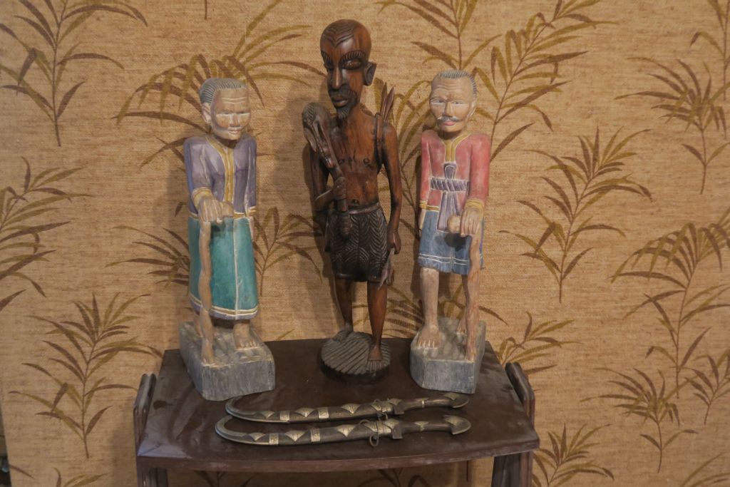2 dagues orientales dans leur fourreau Un étui à couteaux Une paire de sujets de style Extrême-Orient en bois sculpté polychrome "couple de vieillards" Une sculpture africaine "le retour de chasse" en bois sculpté