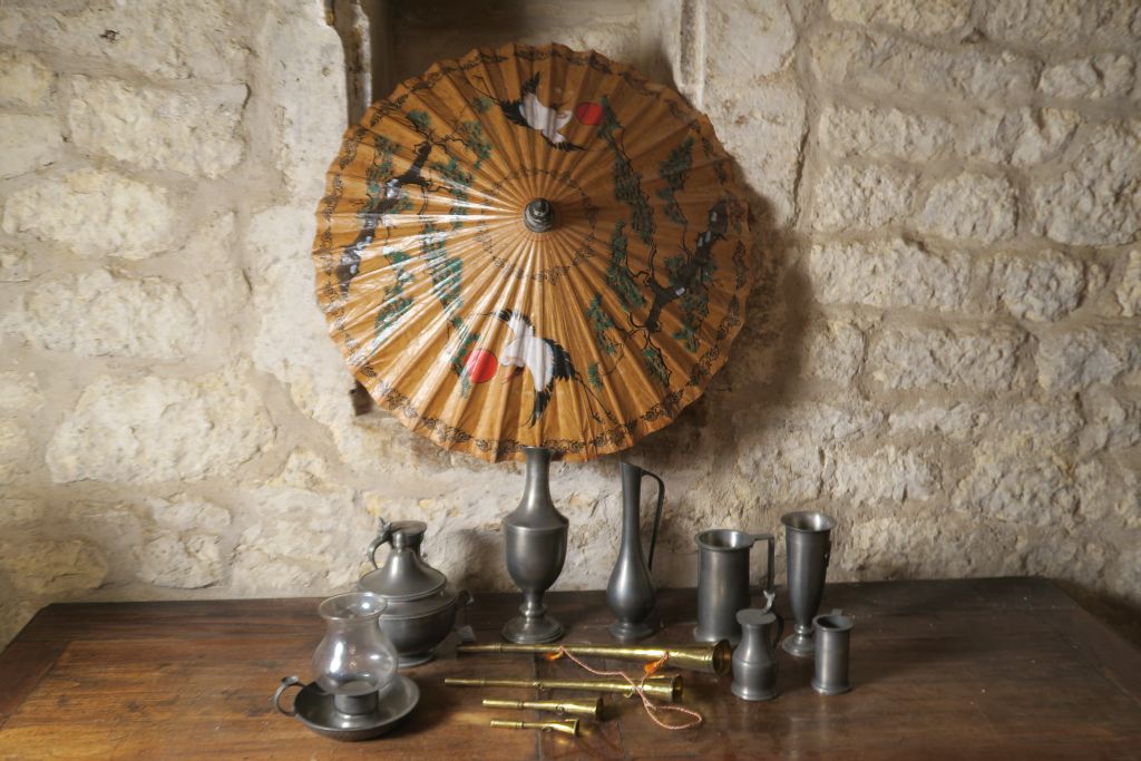 3 petits cors de chasse en cuivre une ombrelle de style extreme orient ensemble de pièces en étain