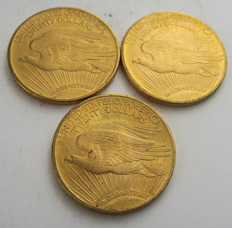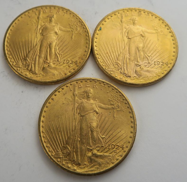 3 pièces de 20 dollars or 1924. Frais acheteur 20 % TTC