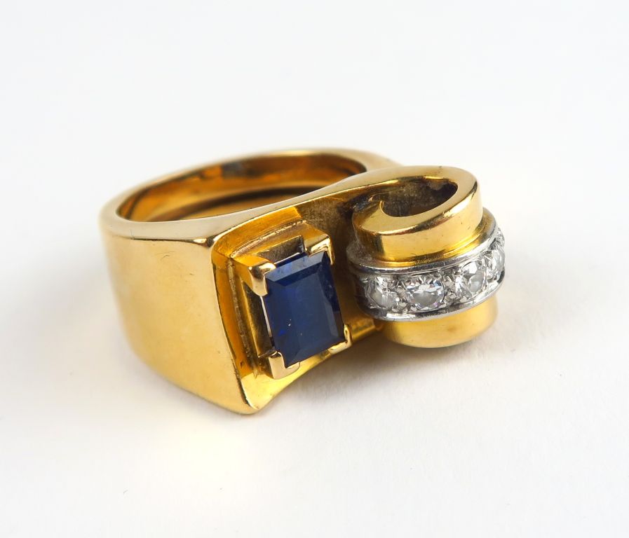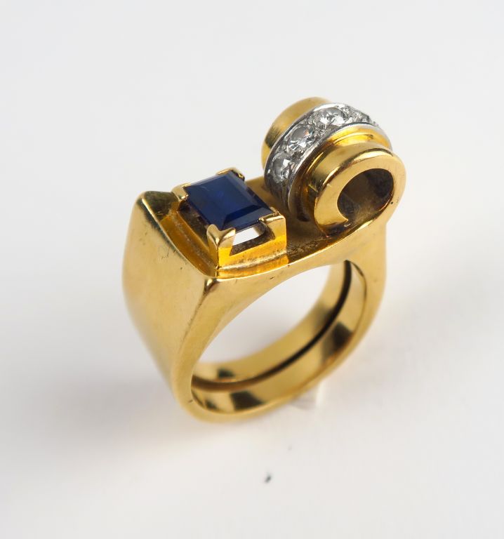 Bague Art Déco en or jaune, ornée d'une ligne de diamants et d'un saphir (traité). Poids tel : 13,56 g