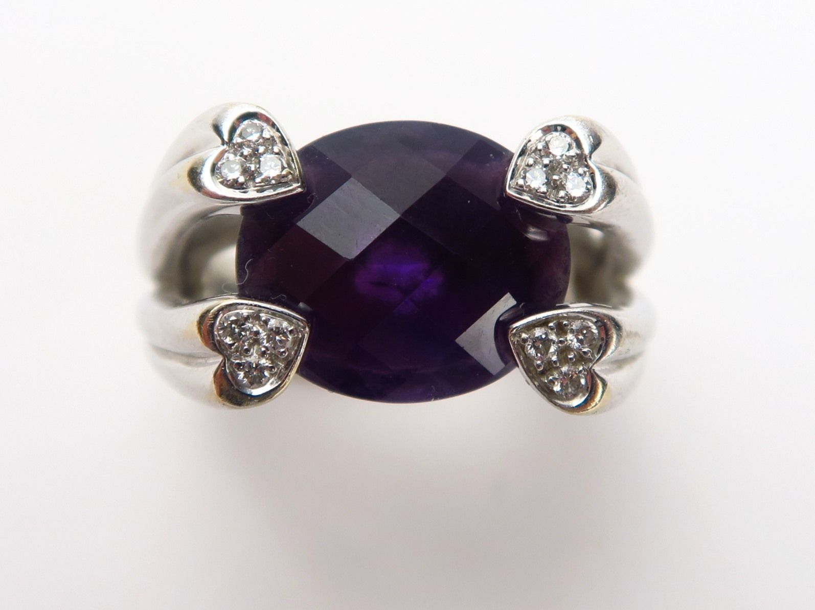 Bague en or blanc, ornée d'une améthyste facettée, monture à décor de quatre cœurs sertis de diamants 8/8. Poids tel : 11,44 g