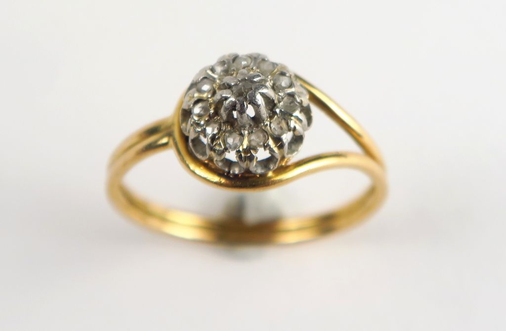 Bague en or deux tons, ornée de diamants taillés en rose. Poids tel : 3,22 g