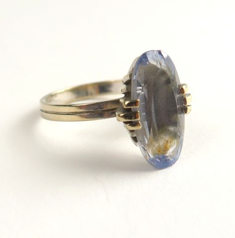 Bague ornée d'une aigue marine de forme navette (égrenures). Monture en or blanc. Poids tel : 4,6 g. TDD : 53