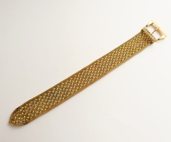 Bracelet ceinture en or, belle maille ajourée, rehausssé sur le passant de 7 diamants taillés en rose. Poids tel : 47,6 g (quelques petites traces de réparations)