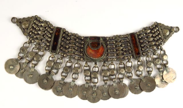 Bracelet de cheville Afrique du Nord en argent ou métal, et plaques de verre. Poids tel : 130 g