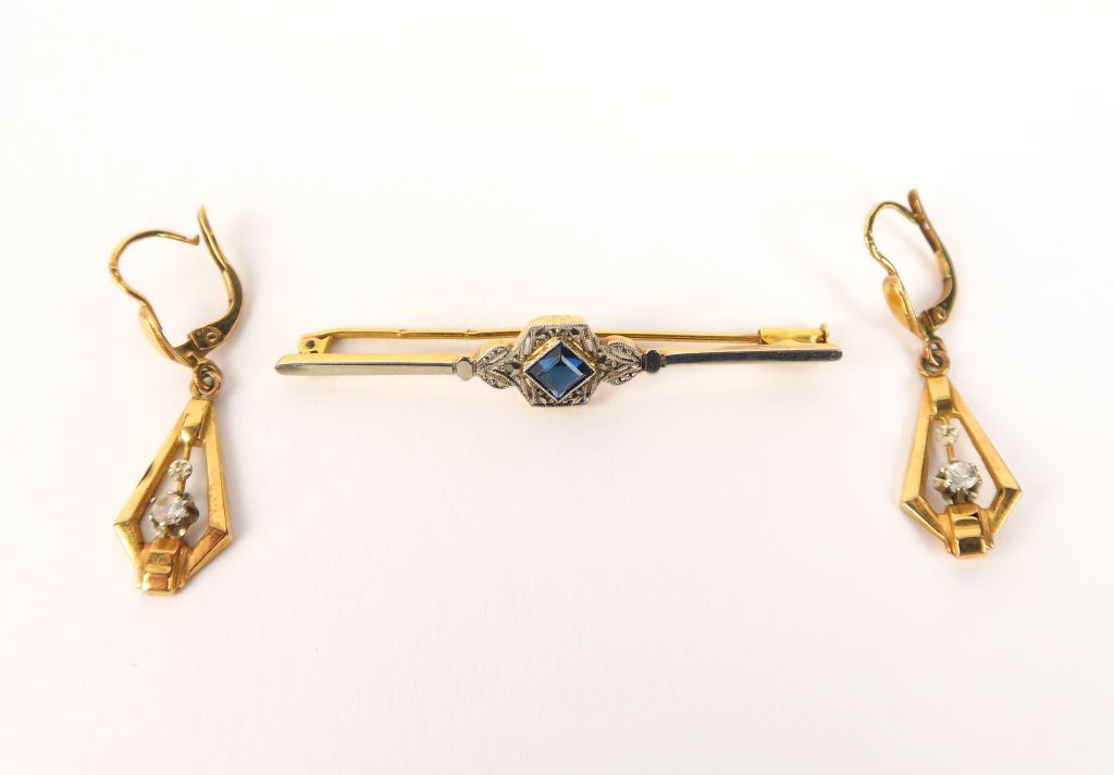 Broche barrette en or et imitation de saphir, on y joint une paire de dormeuses en or et imitation de diamants. Poids tel : 3,68 g