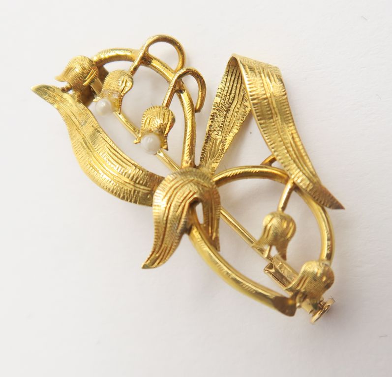 Broche en forme de branche de muguet. Poids : 3,7 g (manques des perles)