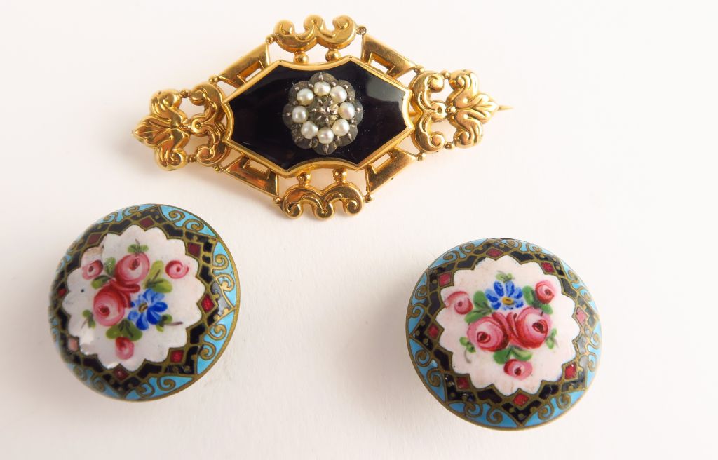 Broche Napoléon III en or émaillé, perles et rose. Poids tel : 4,2 g. Paire de boutons de manchette émaillés à décor de fleurs.