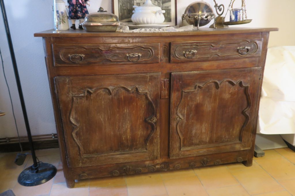 Buffet bas rustique de style Louis XV en bois mouluré ouvrant à deux vantaux et deux tiroirs, dessus bois. Dim. 119 x 168 x 67.5 cm.