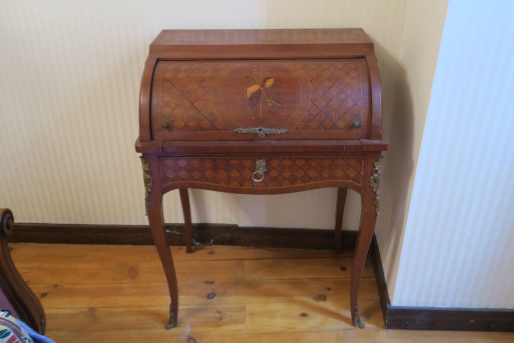 Bureau cylindre de style Louis XV en marqueterie à décor de cubes et trophée dans une réserve, ouvrant à un cylindre dégageant quatre tiroirs et un tiroir en ceinture. Dim. 95 x 69 x 47,5 cm.