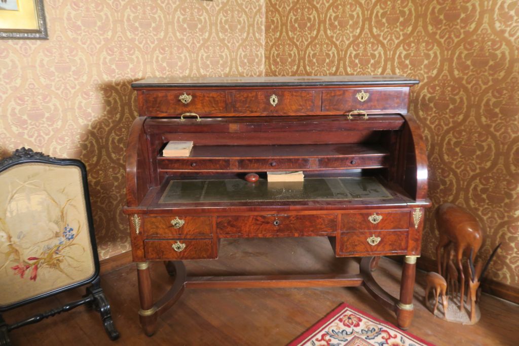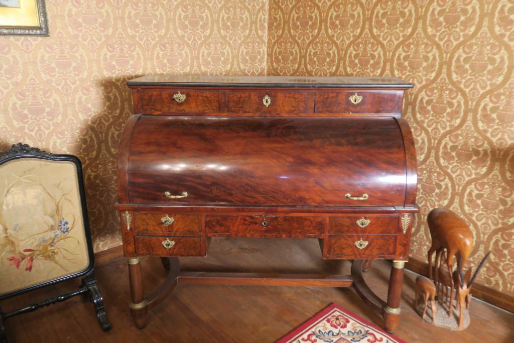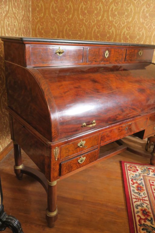 Bureau cylindre Empire en acajou et placage d'acajou ornementation de bronze à décor de personnages et de corne d'abondance, ouvrant à quatre tiroirs en ceinture, trois tiroirs en partie supérieure, un cylindre dégageant un plateau en cuir et trois petits tiroirs , dessus marbre noir. Dim. 127 x 143 x 74 cm.