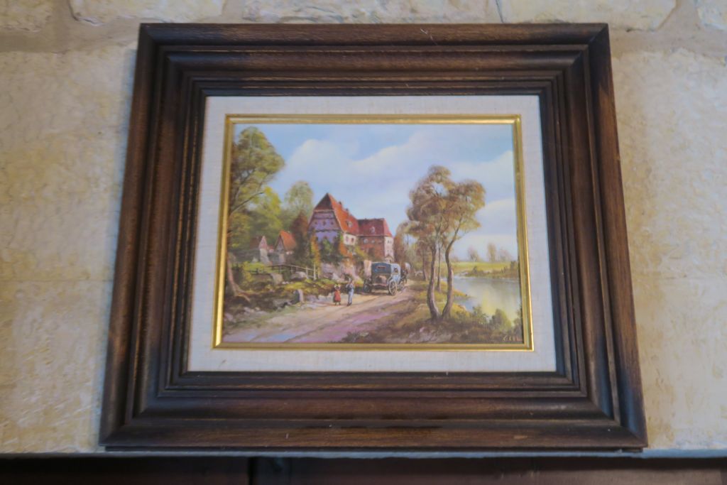 Chromo "la charrette près de la rivière". Chromo d'après Werner dans son cadre en bois doré.