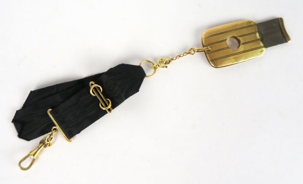 Coupe-cigarillos en or et métal, sur son lien en soie noire. Poids tel : 16,8 g