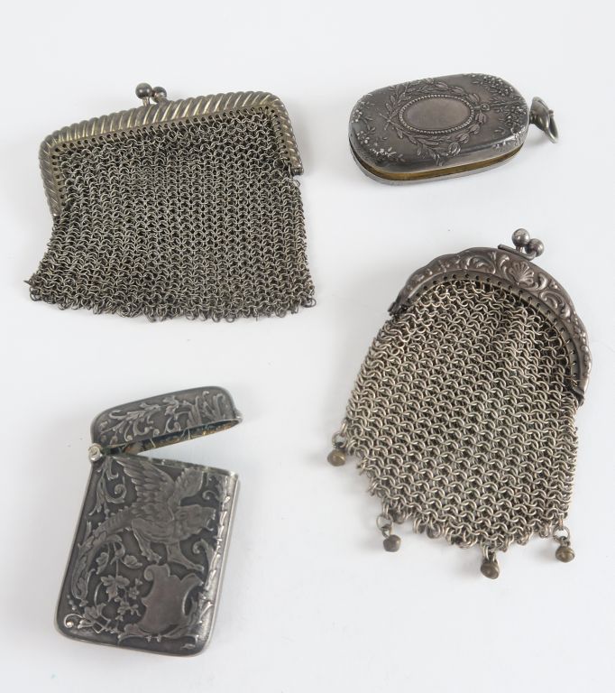 Deux bourses et deux étuis, l'ensemble en argent.