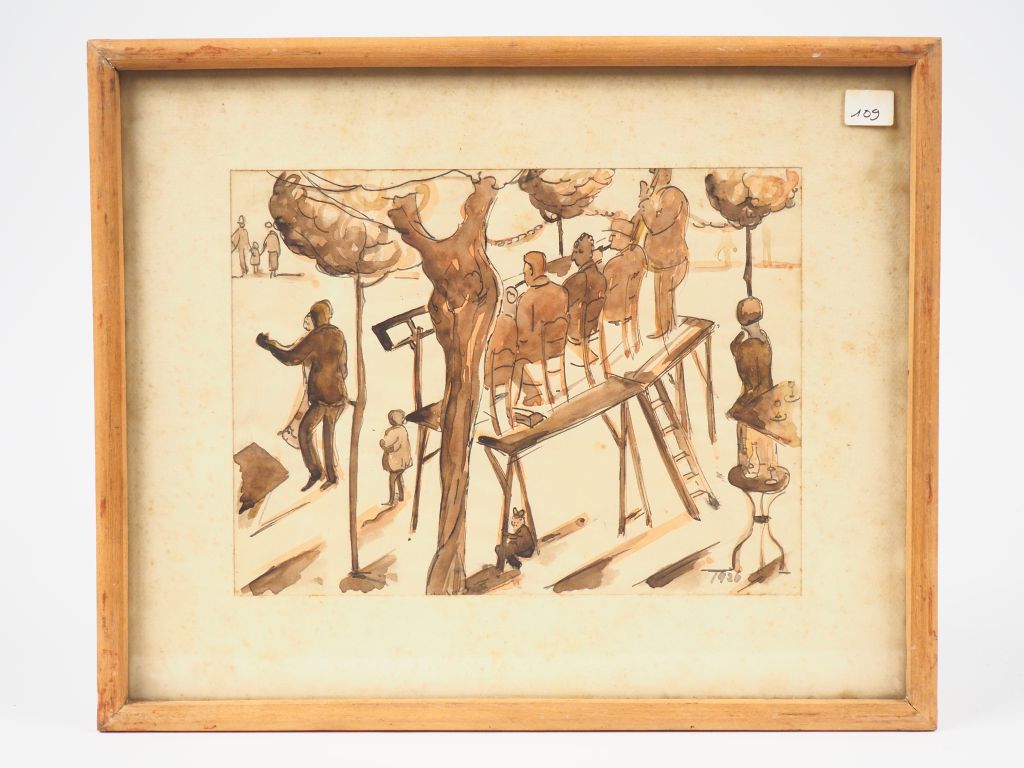 Ecole française XXème. "Le bal en plein air". Lavis, daté en bas à droite 1926 Dim. 19,5 x 26 cm