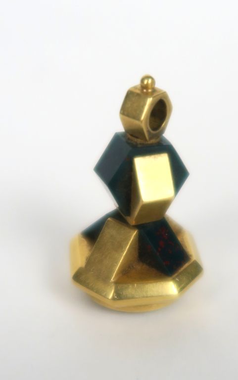 Ensemble comprenant trois éléments de chatelaine : -un cachet et un remontoir de montre en or et jaspe sanguin -une monture de stylo de bal en or. Poids tel : 24,5 g