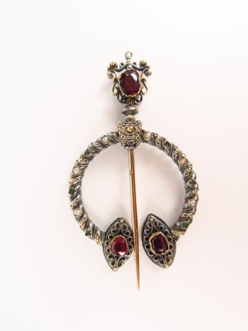 Fibule en argent, épingle en or, ornée de pierres de couleurs et de perles. Poids tel : 16,4 g