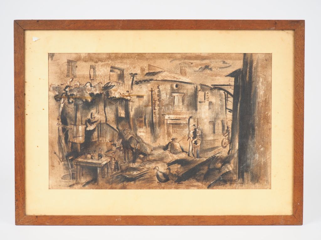 Lot de G. VENTRILLON. "Village animé". Dessin signé en bas à droite Dim. 26 au prix de 50 à 80 € en vente aux enchères par l'hôtel des ventes Primardeco