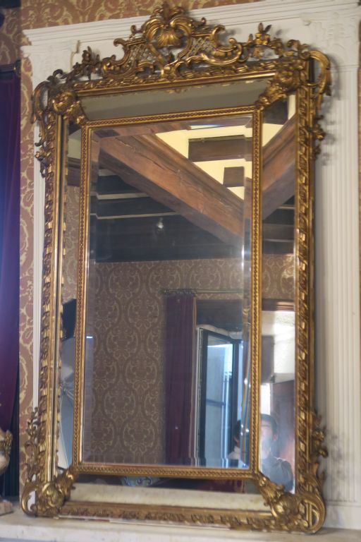 Glace à parecloses XIXème de style Transition à décor de frises de perles de rinceaux feuillagés, surmontée d'un fronton ajouré à décor d'agrafes et de fleurs en relief. Dim. 173 x 108 cm. (spetits auts de dorure et accidents)