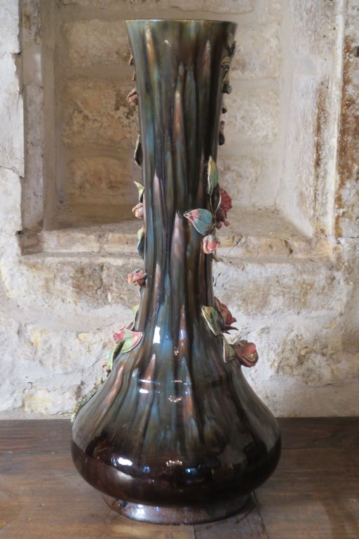 Grand vase 1900 en barbotine à décor de fleurs en relief sur fond mélé. H. 81 cm. (égrenures).