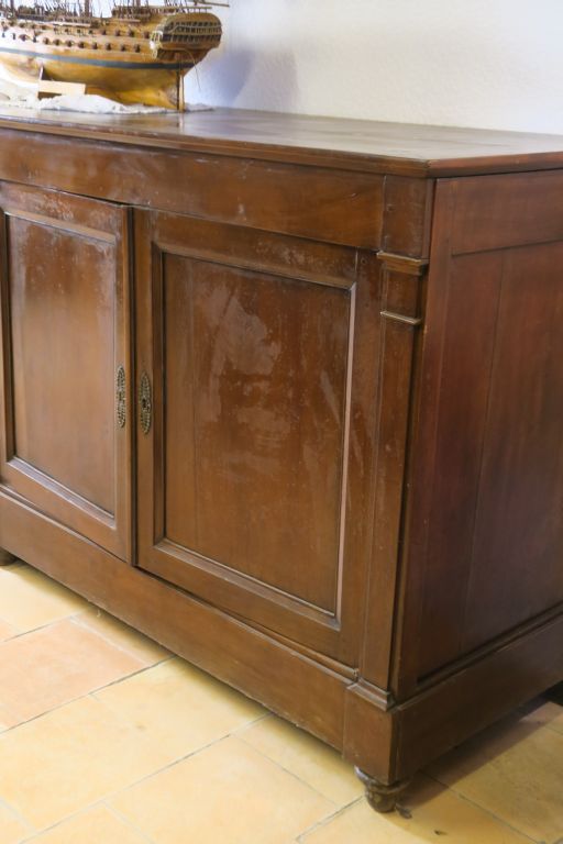 Grande enfilade XIXèmede style Empire en acajou et placage d'acajou ouvrant à quatre vantaux, dessus bois. Dim. 269 x 111 x 64 cm