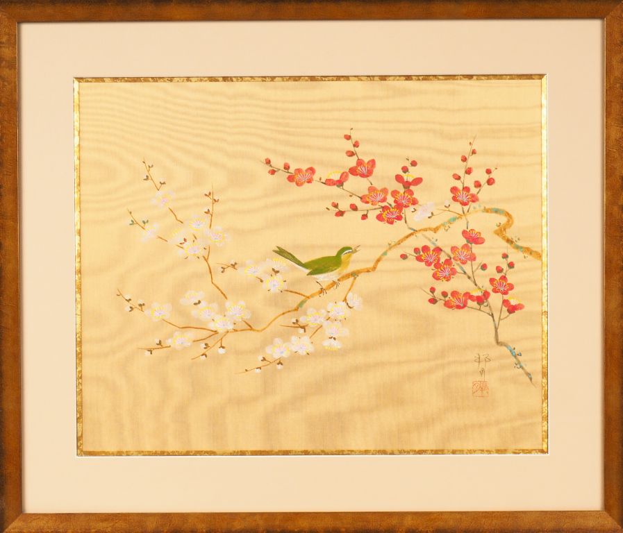 Lot de HOGETSU NAKANISHI. "Oiseaux branchés" Aquarelle sur soie Dim. 38 x 45 au prix de 30 à 50 € en vente aux enchères par l'hôtel des ventes Primardeco