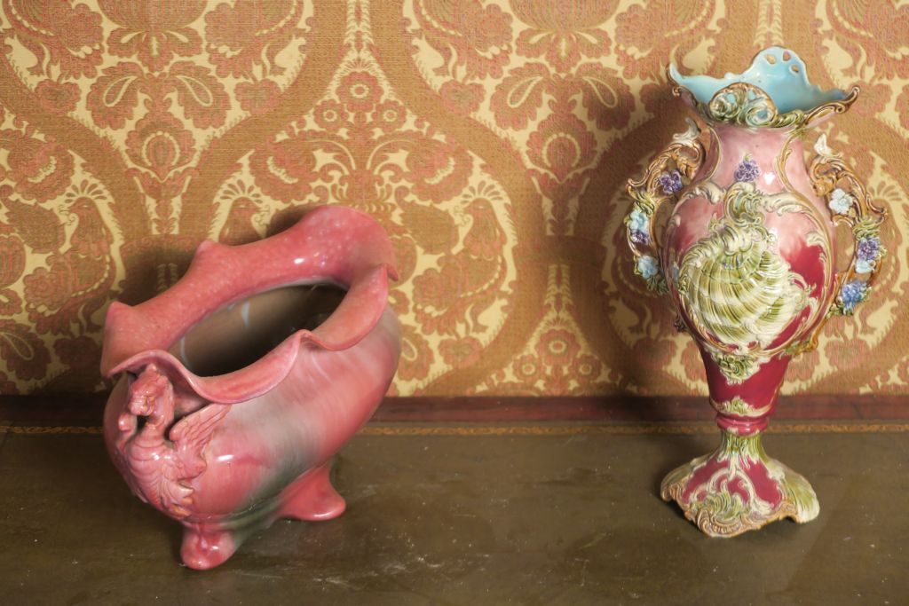 Jardinière en barbotine 1900 à décor de chimères en relief. Dim. 21 x 43 x 18 cm. Vase à anse en barbotine 1900 à décor polychrome de coquillages. H. 38,5 cm.
