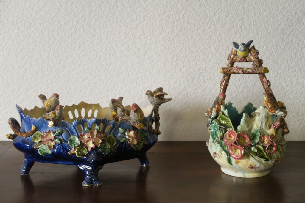 Jardinnière en barbotine à décor de cinq oiseaux en relief. Dim. 16 x 36 x 18.5 cm. (accidents). un panier en barbotine à décor de fleurs et d'oiseaux en relief . H. 30 cm. (accidents).