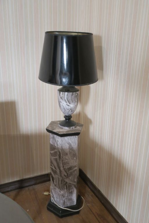 Lampe moderne sur une sellette l'ensemble en céramique à l'imitation du marbre. H. (lampe) : 38 cm. H. (sellette) : 73 cm.