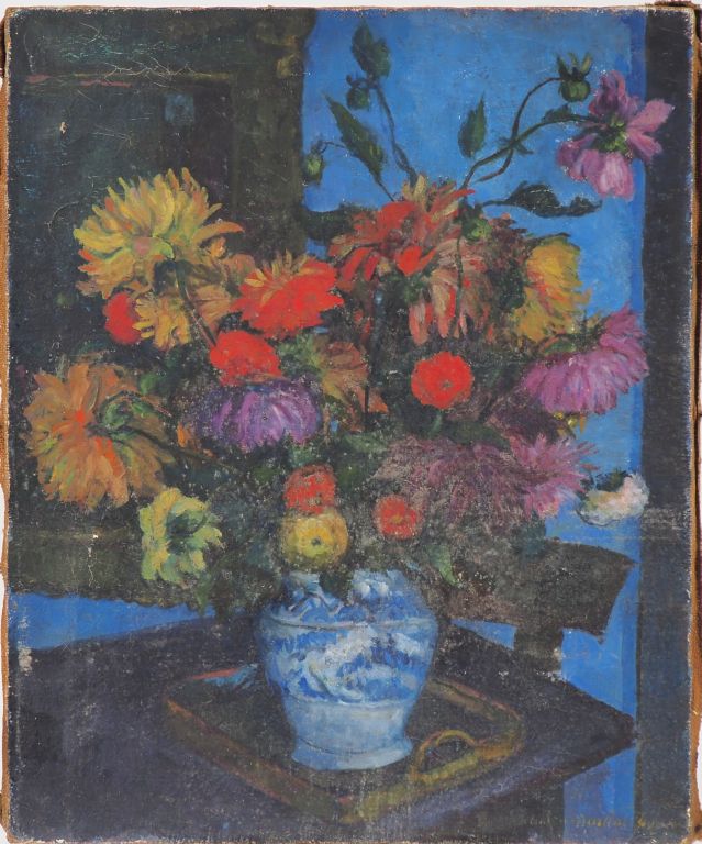 Lucien MAILLOL. "Bouquet de fleurs dans un vase en faïence" Huile sur toile, signée en bas à droite Dim. 73,5 x 60 cm