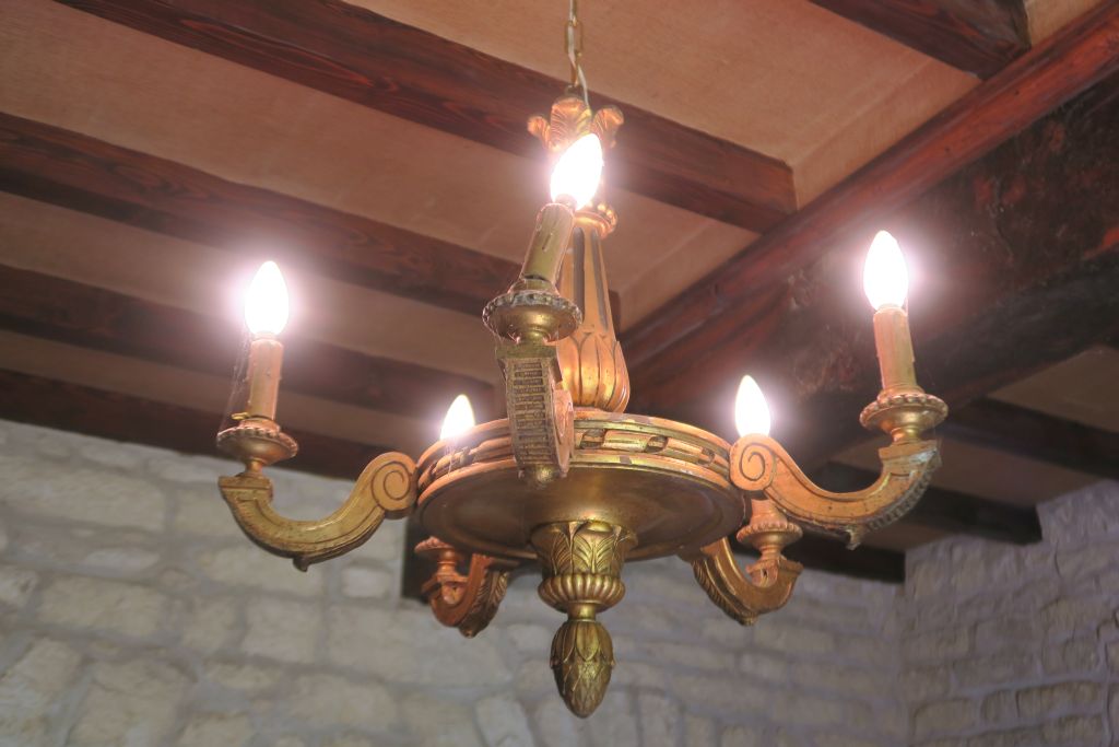 Lustre de style Louis XVI en bois sculpté et doré à décor de pomme de pin et de palmes éclairant à cinq lumières. H. 60 cm.