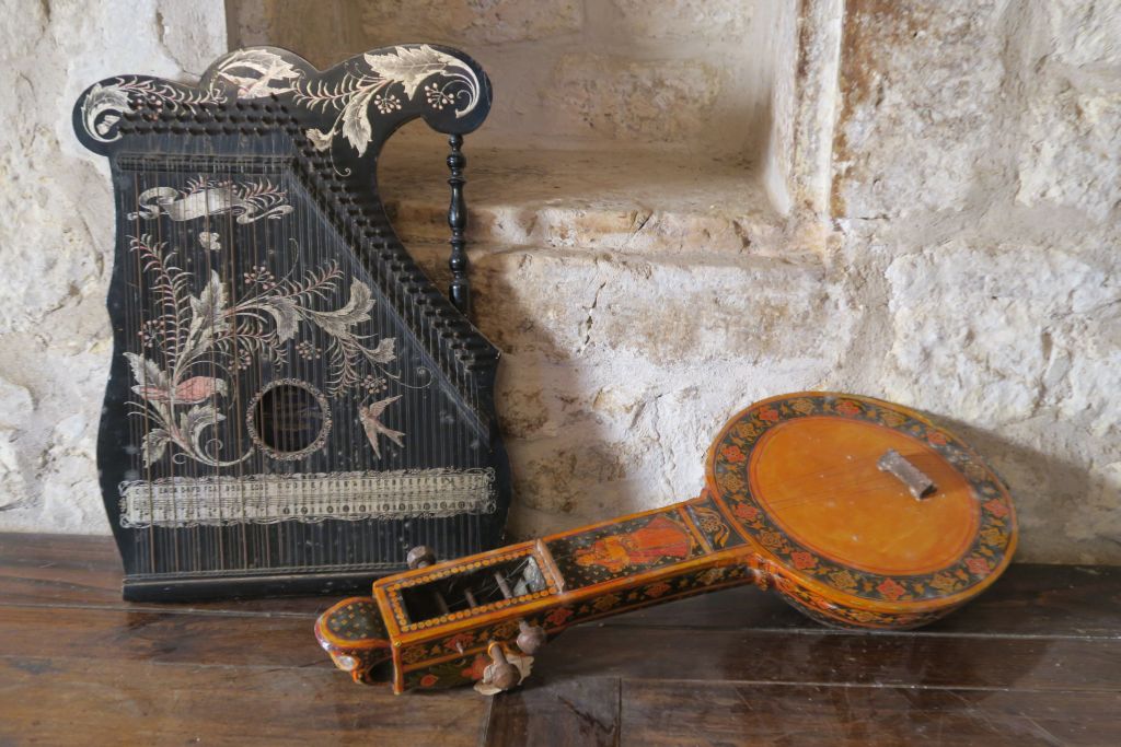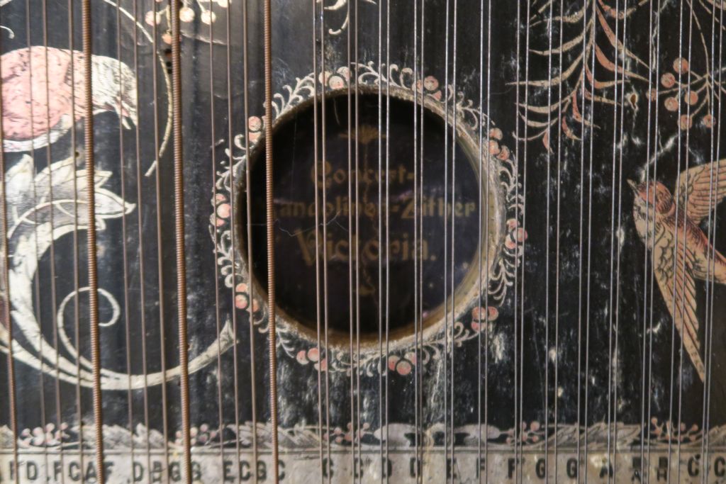Mandoline 1900 en bois laqué noir décor argenté d'oiseaux branchés. Dim. 57 x 44 cm. Une cythare. H. 57 cm