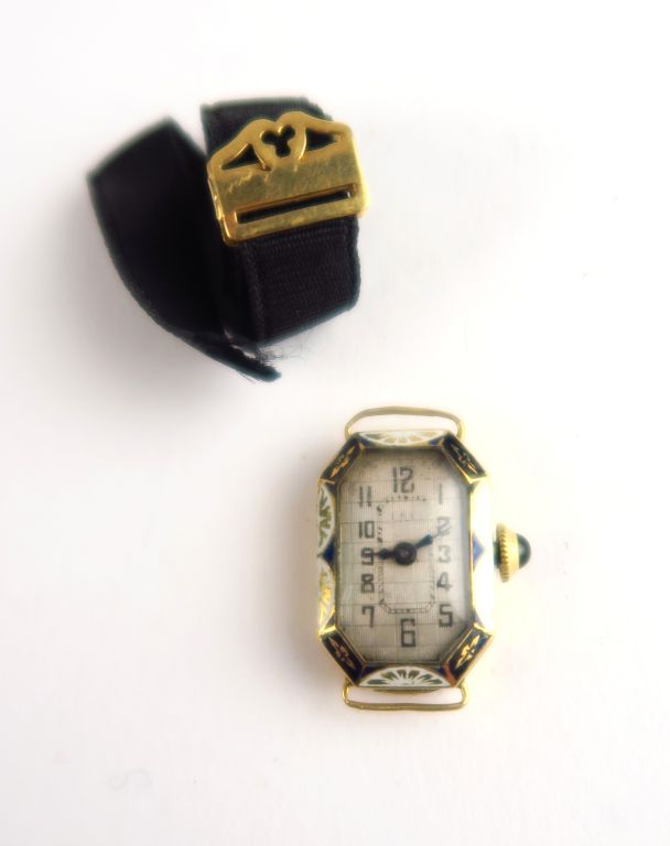 Montre de dame en or, cadran émaillé blanc et bleu, poussoir orné d'un cabochon. Poids tel : 7,6 g