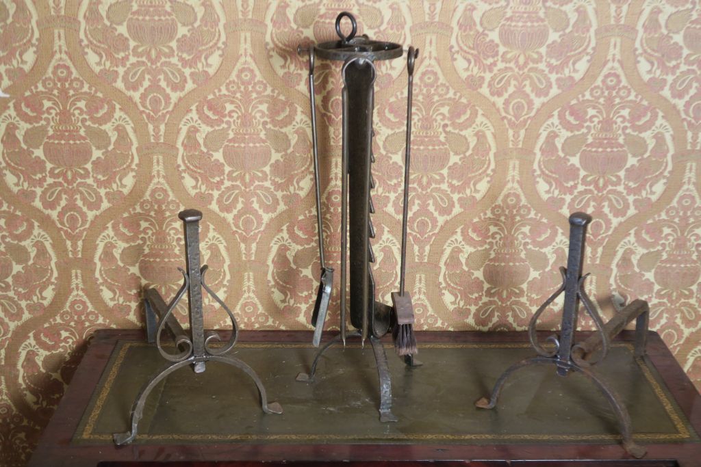 Nécessaire de cheminée : paire de chenets en fer forgé et accessoires de cheminée.