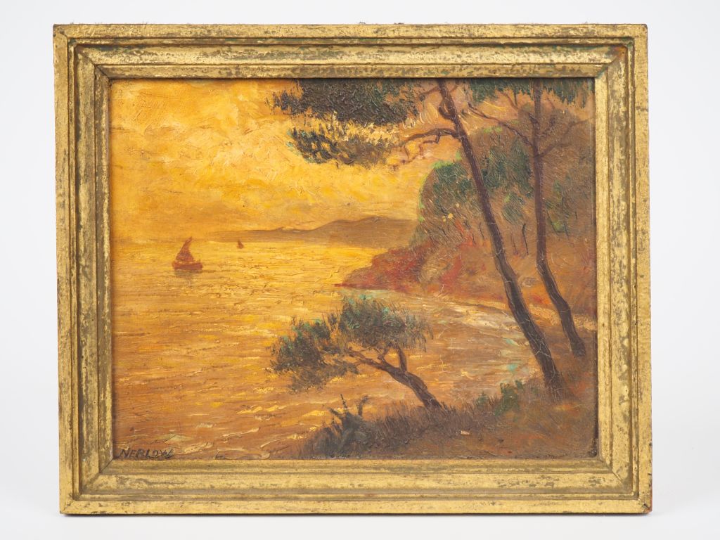NERLOW. "Bord de mer au coucher de soleil" Huile sur carton, signée en bas à gauche. Dim. 19 x 24 cm