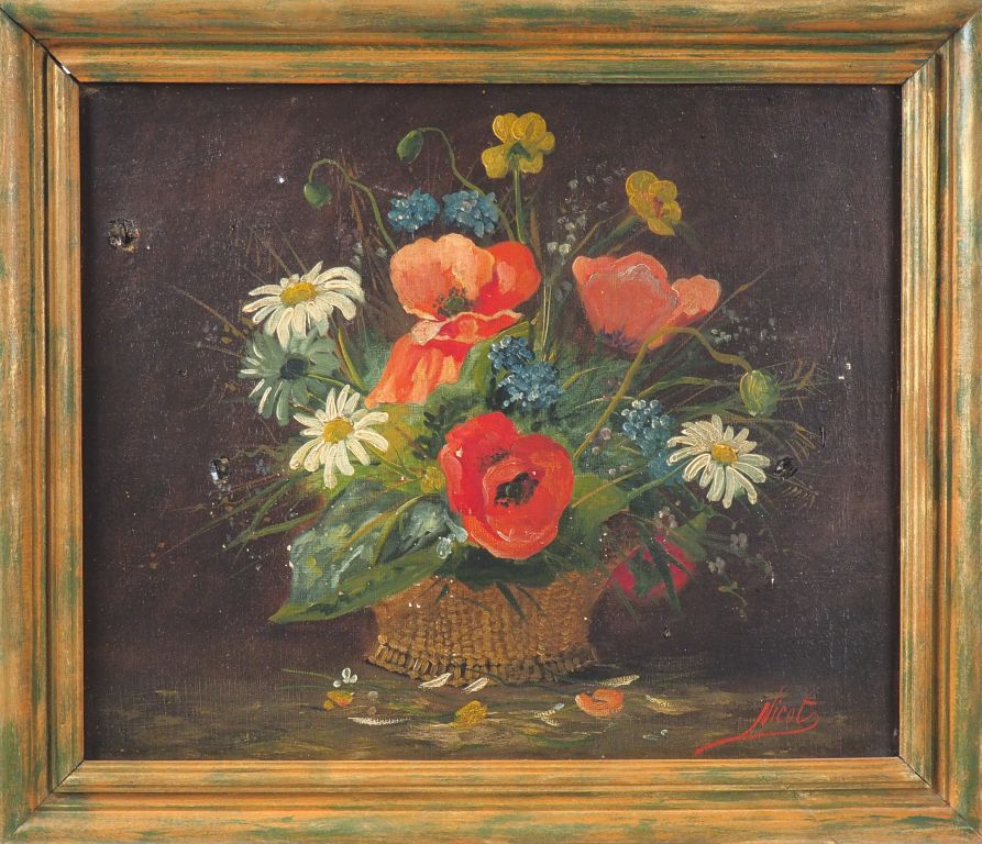 NICOT. "Corbeille de fleurs des champs". Huile sur toile, signée en bas à gauche Dim. 46 x 55 cm