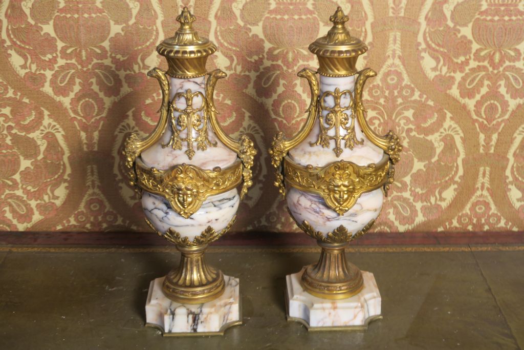 Paire de cassolettes XIXème en marbre et bronze doré à décor de mascarons, de têtes d'aigle et de fleurs en relief H. 48 cm