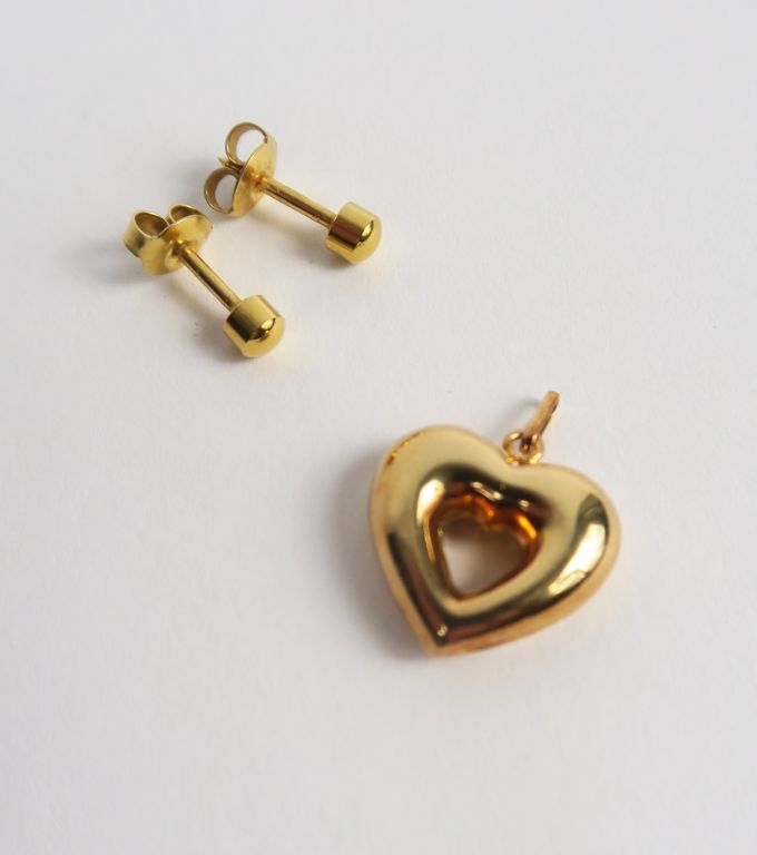 Paire de clous d'oreilles et pendentif en forme de cœur. L'ensemble en or. Poids : 2,5 g