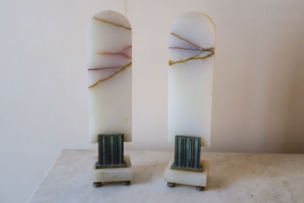 Partie de garniture de cheminée de style Art déco en bronze, laiton et onyx en forme d'obélisque