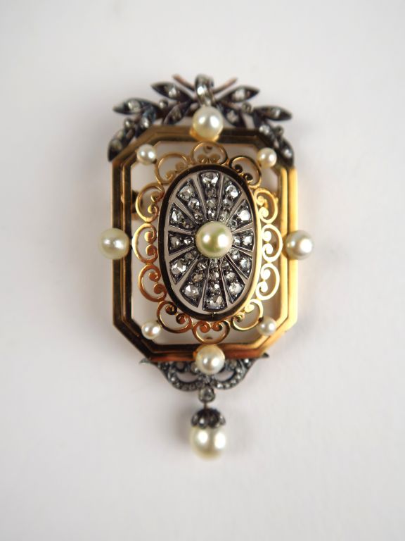 Pendentif Napoléon III en or jaune et or blanc, orné de perles et de roses. Poids tel : 28 g