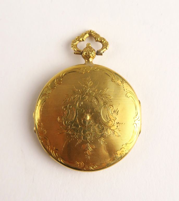 Pendentif porte photo en or gravé de rinceaux fleuris. Poids : 5,17 g