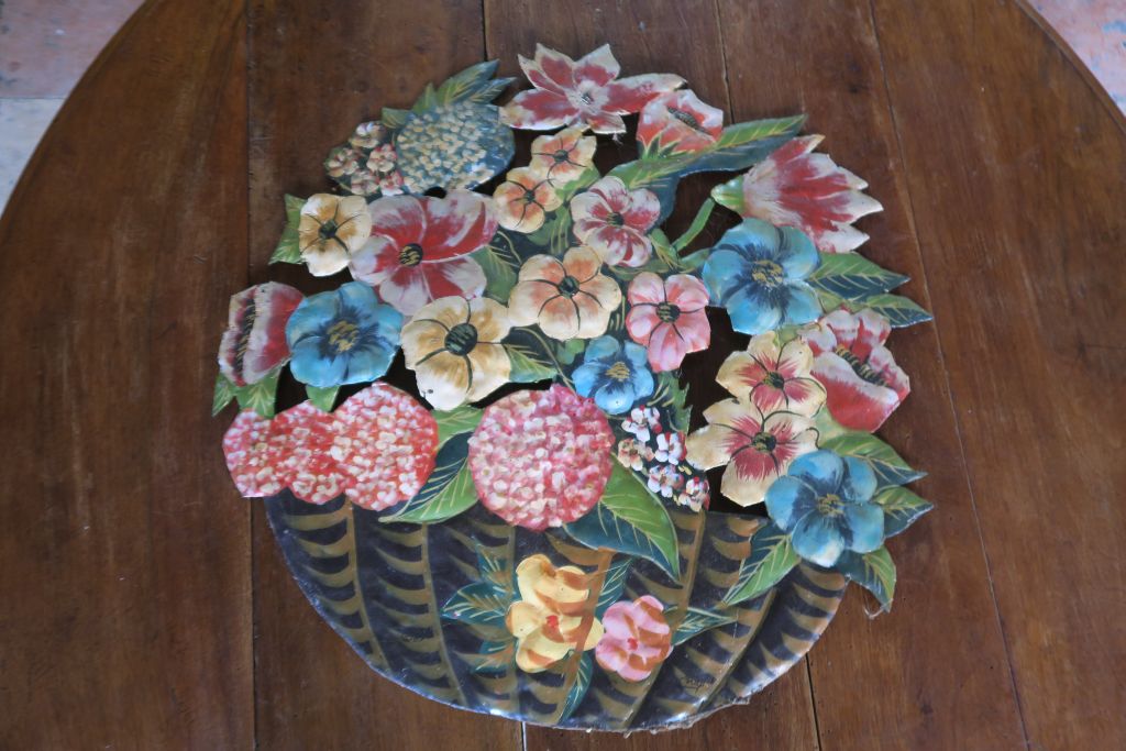 Plaque murale en métal peint à décor de fleurs. Dim. 61 x 60 cm.