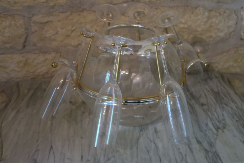 Lot de Rafraichissoir en verre et métal doré et six flutes à champagne en cri au prix de 60 à 80 € en vente aux enchères par l'hôtel des ventes Primardeco