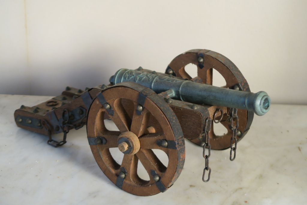 Réplique de canon en bronze, bois et métal.