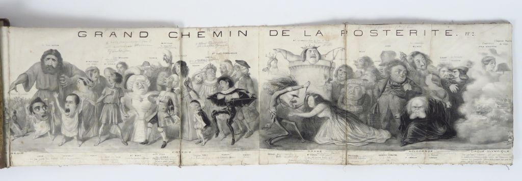 ROUBAUD (Benjamin). Dit BENJAMIN. Le Grand chemin de la postérité. Paris, Aubert (ca 1842). in-4 oblong. 1/2 basane (Rel. de l'époque) Vaste panorama satirique de l'école Romantique, formant un long cortège charivarique, lithographie en noir de 4,10 m sur 27 cm. Suite rare complète de toutes ses parties : Hommes de lettres, auteurs dramatiques, romanciers et acteurs. En tête de cortège Victor Hugo jeune, au front immense, chevauchant un Pégase ailé à queue de dragon portant un oriflamme sur lequel on lit : "Le laid, c'est le beau". Les lithographies ont été entoilées et montées en éventail. Reliure usagée. Salissures en marge et aux marques de pli