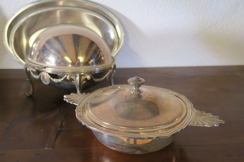 Seau à champagne une soupière un légumier un réchaud 2 plats ronds et deux plats ovale, l'ensemble en métal argenté