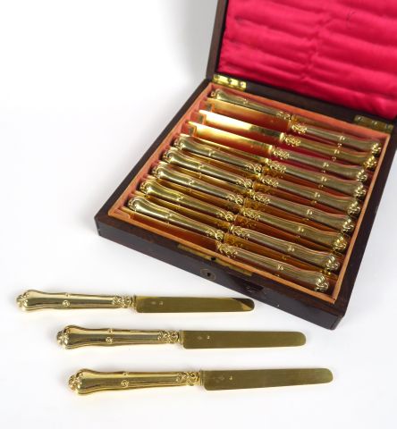 Suite de 18 couteaux à fruits lame en vermeil, poinçon Minerve, manche vermeil fourré. Poids tel : 678 g