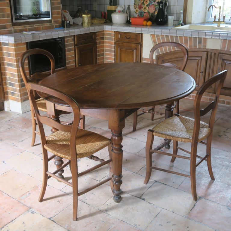 Table de cuisine à abattant de style Louis Philippe en bois mouluré et quatre chaises paillées (état moyen)
