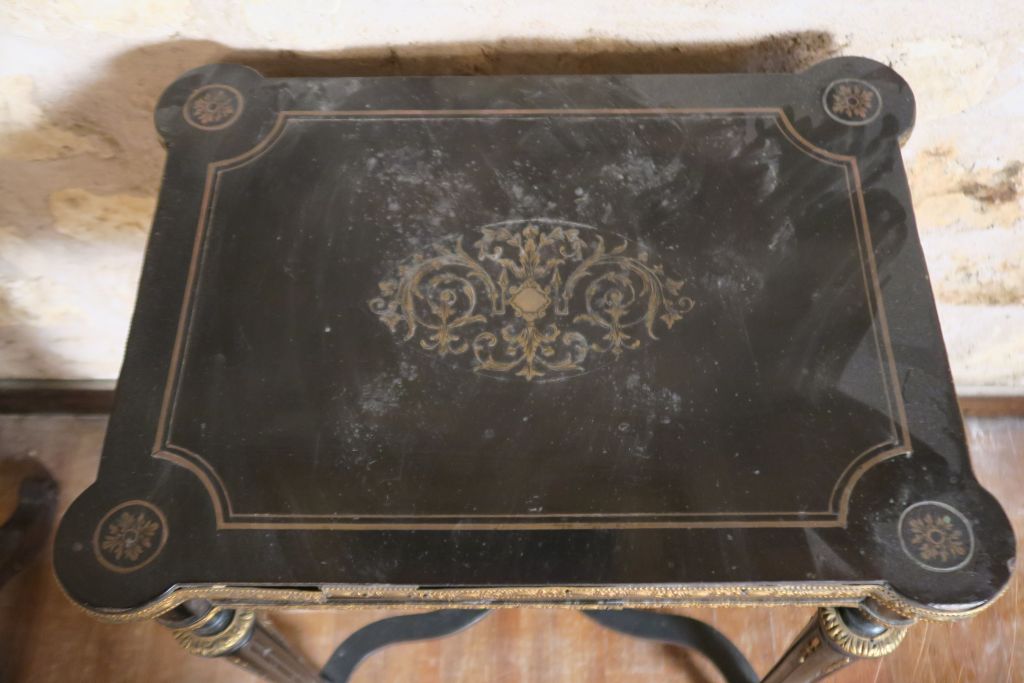 Travailleuse Napoléon III de style Louis XVI en bois noirci et marqueterie Boulle, ouvrant à un abattant, intérieur en acajou. Dim. 75 x 54.5 x 40 cm.